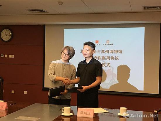 8月20日,苏州博物馆馆长陈瑞近与北京画院美术馆馆长吴洪亮在北京画院共同签署了苏州博物馆与北京画院美术馆战略合作框架协议。