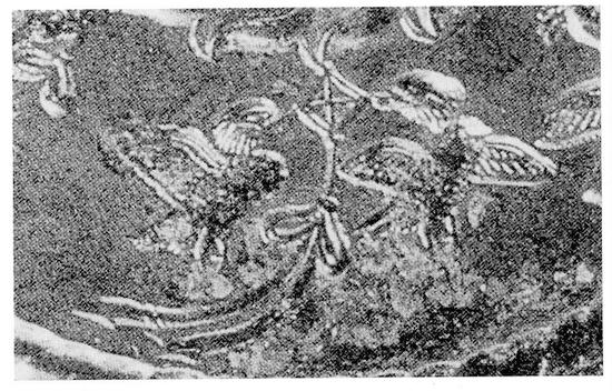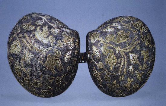 其次,从工艺美术的杰作中寻找“同心结图”,发现了与前面的织锦相近的穷尽匠心之作。图9为“飞鸟莲华文镜”中所再现的鸳鸯,从两侧銜住绶带,并从所作二圈有线端垂下的造型,与前面的织锦具有共通之处,不过,同心结上并非环,所系为菱形的装饰。图10为“鸳鸯文蛤形银盒”,相向的鸳鸯从两侧衔住绶带,鸳鸯的胸前为结目及四根线端,两两成对,左右并置。这也是同心结的一种。衔着绶带或连珠鸟类的图纹一般统称为“含绶鸟文”,虽然一直被认为是西方传来的创意,这一去掉图纹在被接受过程中与中国传统思想相结合,才诞生了“衔同心结的一对鸳鸯”这样的吉祥图。