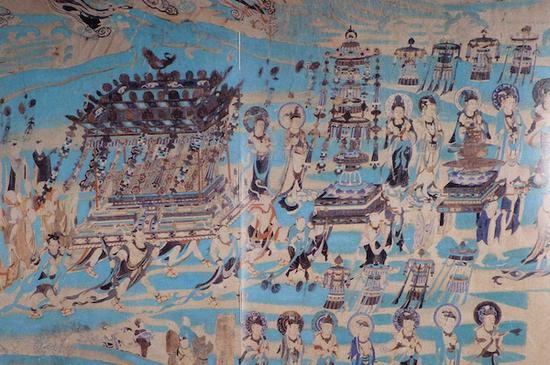 最后所要讨论的是,正仓院宝物“华曼残欠”(图15)。用草蔓作芯,将罗带编结成复杂的图纹,左右对称系有带圈,从结目出来线端长垂的形状,如果与前文的石椁线刻画那般,将其佩带于腰间,则就应该是同心结。正仓院中这样的细带、丝带的装饰品很多,其中之一有“花漫绪长一尺六寸天平胜宝八岁五月十九日纳东大寺”的笔迹,此华曼在图录中解说“圣武天皇葬礼所用之物”9。用这种“华曼”的情况描绘在敦煌第一四八窟“天请问经变”中所见葬礼的场面中,安置棺木的皇舆上盖着宝盖,用带子结成的许多华曼飘摇的样子。恐怕正仓院的华曼,也是圣武天皇葬礼之际悬挂的与此壁画相同、安置棺木的床帐宝盖一类的物品。