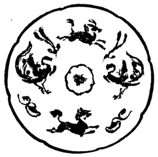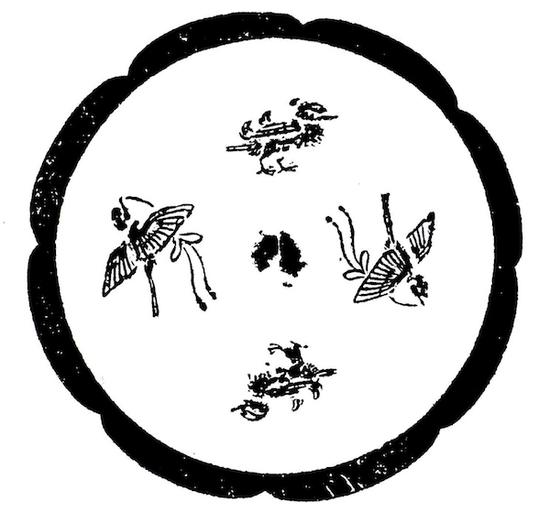 口衔同心结的含绶鸟除了鸳鸯以外还有喜鹊。喜鹊是在七夕之夜,为牛郎织女相会在银河搭架桥梁之鸟,与鸳鸯同样,作为男女之间爱情桥梁的喜庆鸟类。图11是唐镜图纹代表之一,通常称为“月宫盘龙镜”,下方表示海,海上是作为皇帝象征的舞动着的龙。上方以小圆表示月,衬托有月桂树及捣药的兔子等等,营造了与月亮传说相关的氛围,是表示天地的一种宇宙图。需要注意的是画面中央,衔住绶带,向月飞翔的一对喜鹊。此绶带左右有圈,且有两根线端长垂的单纯的造型,相当于前面所见图3图4同心结下半部分。前文言及月光是对远方伴侣的暗示,月光下对远在战地的丈夫的思念的诗歌,如刘元叔《妾薄命》: