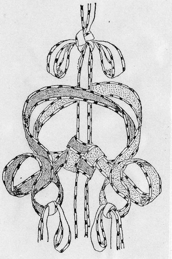 上文考察了绘画资料中的同心结的例子,它们几乎都由多个结目组成的复杂物品,形状必然有所不同,因此也就存在各种各样的同心结。同心结既然是“爱情的护符”,那么耗费精力作出漂亮的作品过程中心情应该会发挥作用,正是如此,以往宫廷中出现如此多姿多彩的“倾注爱意”的同心结,以各种形态在宫廷女性的腰间摇曳。此外,与前面例子比较,可见同心结的基本构造采用“结目+环+结目”的形式,最上段的结目与最下段的结目都是用左右对称的圈子作成,这应当是一种“蝴蝶结”。同心结的原意,即“作为结法名称的同心结”,本来指的就是这种结法。
