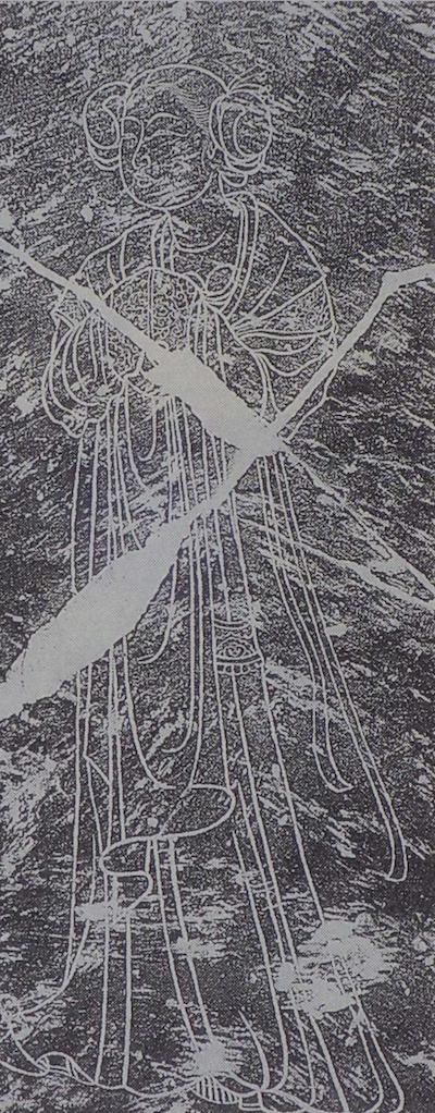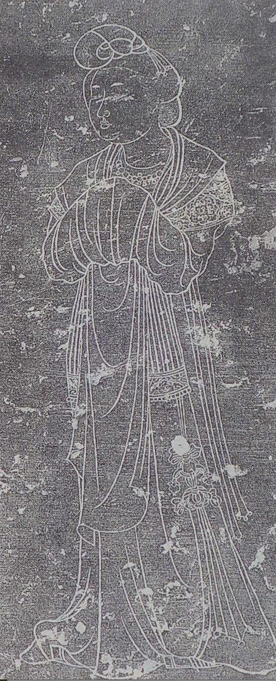 图3,图4为山西省皇甫村,薛儆墓出土的石椁线刻画,体侧从腰部开始垂有长装饰带。这与懿徳太子墓壁画中的宫女所佩带的形状不同,在两结目之间有花形装饰,带子的末端长垂。可以说“一双”所形容的正与这两根线端相对应。此外,图4的带子还细致地描绘出布料的图纹,可以证实先前从唐诗作品中同心结以绫绢、锦制作的推测。