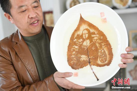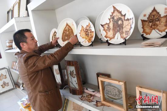 3月2日,山西省襄垣县小堡底村,民间艺人郝旭东展示其制作的脸谱叶雕作品。这种在树叶上作画的形式叫做叶雕,一幅作品需要经过树叶采集、防腐加工、叶肉剥离和制模雕刻四个步骤,最简单的叶雕作品至少也需要3天时间才能制作完成。郝旭东曾是一名剪纸艺人,9年前接触叶雕这门艺术便被其吸引,几年来制作叶雕作品数百件。