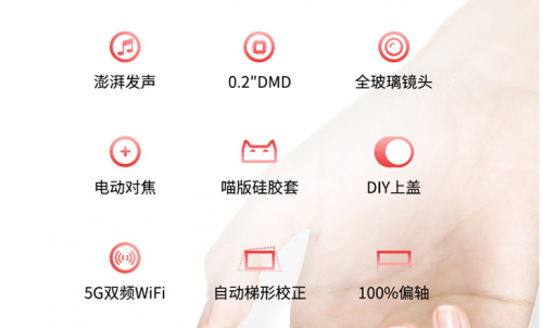 T9智能投影仪,智能投影音箱,可拆装结构,搭配多彩上盖,还有那软萌的宠物硅胶保护套,彰显年轻和个性化元素。硬件配置上,采用0。2DMD光学驱动芯片,亮度200ANSI,方形像素架构,去除边缘锯齿,成像清晰明亮;新一代的DLP数字光处理技术,带来了艳丽通透的视觉体验,画面层次丰富,细腻逼真;进口LED光源,稳定更耐用,无需更换和维护,镜头覆盖镧系玻璃镜片,高透光率,耐磨不变形;内置大功率全频扬声器,内嵌低音振膜单元,高音饱满,中音平稳,低音澎湃有力;机身配备多种功能接口。