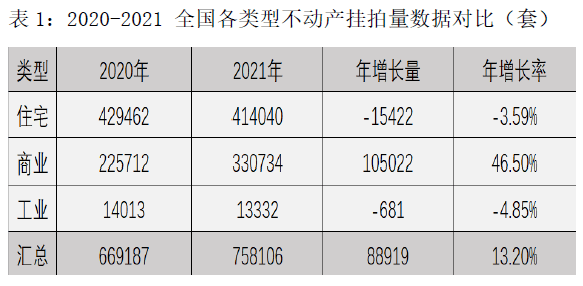 据海豚选房发布的《2021年司法拍卖房行业白皮书》,截至2021年12月末,全国司法拍卖不动产挂拍758106套,较2020年底增长了13。2%。其中住宅类挂拍量414040套,较2020年底减少了3。59%;商业类挂拍量330734套,较2020年底,增长了46。5%。