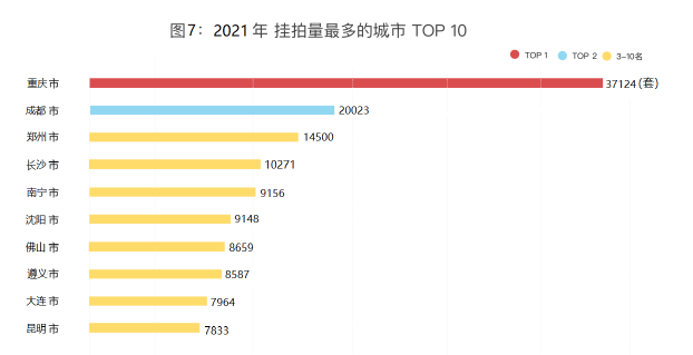 就成都而言,2021年挂拍量为20023套房源,排名第二位,排名第一位的重庆市的挂拍量多达37124套房源。海豚选房的数据显示,2021年全国共有349个城市产生了司法拍卖资产。司法拍卖上拍资产都来自于债务违约,所以上拍数量多的城市大部分来自于经济活跃的一二线年挂拍量前十大城市共挂拍资产133265套,占所有城市挂拍量的17。5%。