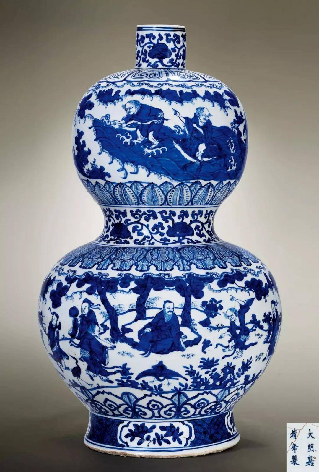 本品为嘉靖御瓷葫芦式瓶当中非常珍罕的一类,其上下腹均丰硕圆润,口部细直,圈足高深外撇,颇见豪迈古拙之气。其口沿与束腰均绘缠枝灵芝纹,上腹上下饰变形莲瓣纹和蕉叶纹,中间主题图案则是五仙行乐图,见有寒山凌波戏水而行,刘海骑金蟾腾飞,拾得携帚而坐,似与执杖佩葫芦仙人对语,后面松下仙人则执笔书卷,神态悠然。下腹主题为群仙贺寿图,场面热闹非凡,共有十三位仙人为寿星祝寿。见寿星端坐石上,泰然自得,观刘海为之戏蟾,众仙献寿,见有捧灵芝托蟠桃者,持宝瓶敲鱼鼓者,吹紫箫鸣玉板者,络绎不绝,气氛喜庆祥和。圈足外侧锦地四开光绘折枝瑞果纹。其青花一色浓妍泛紫,为回青典型之特征,绘画繁缛细致,众仙仪态不一,生动逼真,各见精彩,尤以寒山拾得为佳,拙朴木讷,又不失活泼、诙谐,与嘉万时期画家尤求所作《寒山拾得图》极为相似,由此可见画手技法不凡。底款楷书「大明嘉靖年制」,字体稚拙古朴。