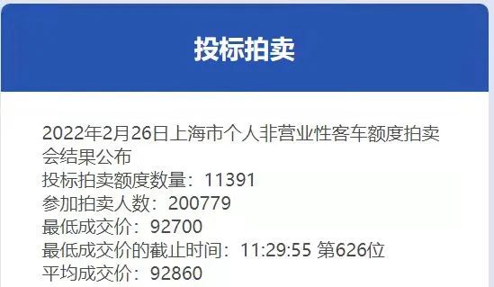个人额度投放10300辆,个人在用车有效额度委托拍卖1091辆,合计拍卖总数11391辆,参加拍卖人数200779人,比上月减少1094人,中标率5。7%。最低成交价92700元,平均成交价为92860元,比上个月的93190元减少了330元。最低成交价的截止时间是11!29!55第626位。你拍中了吗?