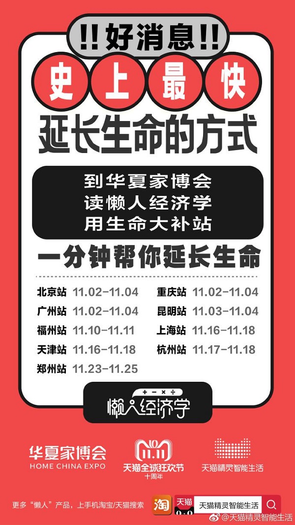 2018年11月2日,华夏家博会冬季展将正式拉开帷幕,天猫精灵智能生活联合华夏家博会共同打造的极智生活节也将陆续登陆北京、上海、重庆、广州、杭州等9大核心城市,为消费者带来集功能化与趣味化于一体的场景化体验,通过轻松有趣的互动将能动口就无需动手的懒人经济学呈现给消费者。