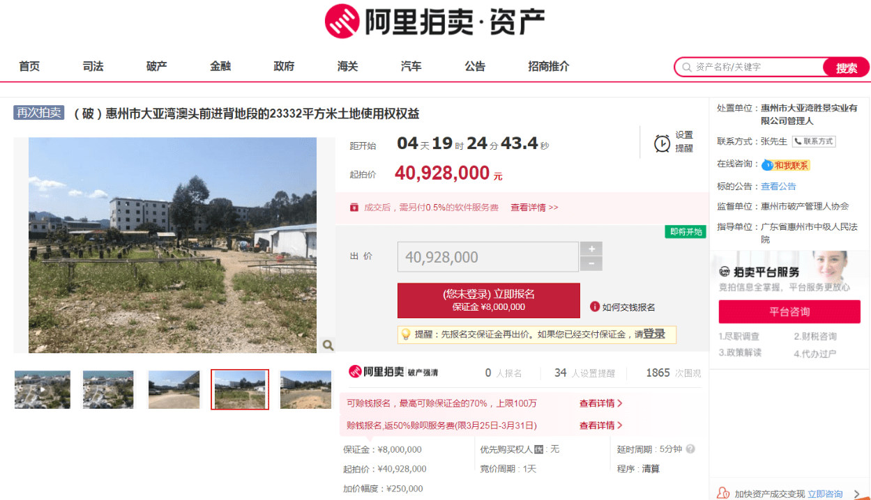 破产拍卖标的物为“惠州市大亚湾澳头前进背地段的23332平方米土地使用权权益”,土地用途为商住用地,土地使用终止日期为2042年9月7日。该标的物无查封,无抵押,无租赁。评估市场价值为133225720元,合同权益评估价为79935432元,起拍价为40928000元,保证金为800万元,增价幅度为25万元。