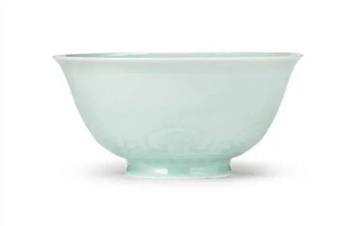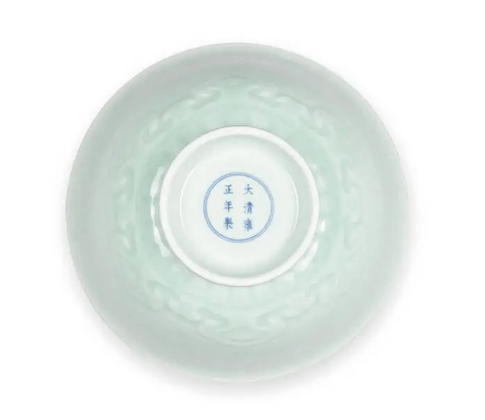 此碗胎质细腻坚润,釉面肥腴匀净,釉色淡雅柔和,近足及口沿处所饰纹饰清晰工整。除此之外碗身虽不加任何装饰,但毫不失雅致,完美展示出雍正时期青釉器无与伦比的美。