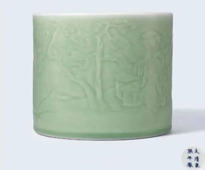 该笔筒圆口直壁,外壁罩豆青釉,暗刻渔翁独钓于江岸,内壁及底足施透明釉。此类豆青釉暗刻笔筒本不多见,又书有康熙本朝款更为珍罕。