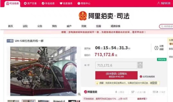 记者从评估报告中获悉,这架待拍的UH-12E直升机的产权持有人为席勒航空产业集团有限公司,目前被镇江经开区法院查封,直升机就存放于该公司厂区内。这次司法拍卖源自镇江市润州区建筑装璜配套工程有限公司与席勒航空产业集团有限公司的一起建筑工程施工合同纠纷执行案件。私人直升机这种特殊的标的物,在以往的司法拍卖中比较罕见。