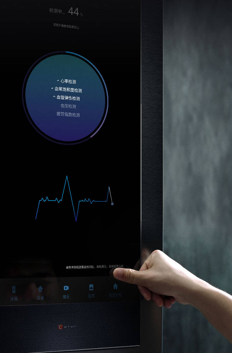 TCL C5智屏冰箱作为一款智慧+健康的冰箱,其智慧大屏具有指脉识别功能,可以测量你的血压、血氧饱和度、血管弹性等健康数据。它可以根据你的身体状况,为你定制专属私人健康菜谱,帮助你在日常饮食上注重膳食营养的合理搭配,让你每天吃得美味又健康。