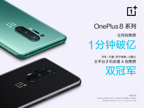 4月17日,刚刚发布的一加 8 系列全面开售,首销战绩火爆,开售后仅 1 分钟全网销售额破亿,并获得京东、天猫、苏宁易购、分期乐全平台