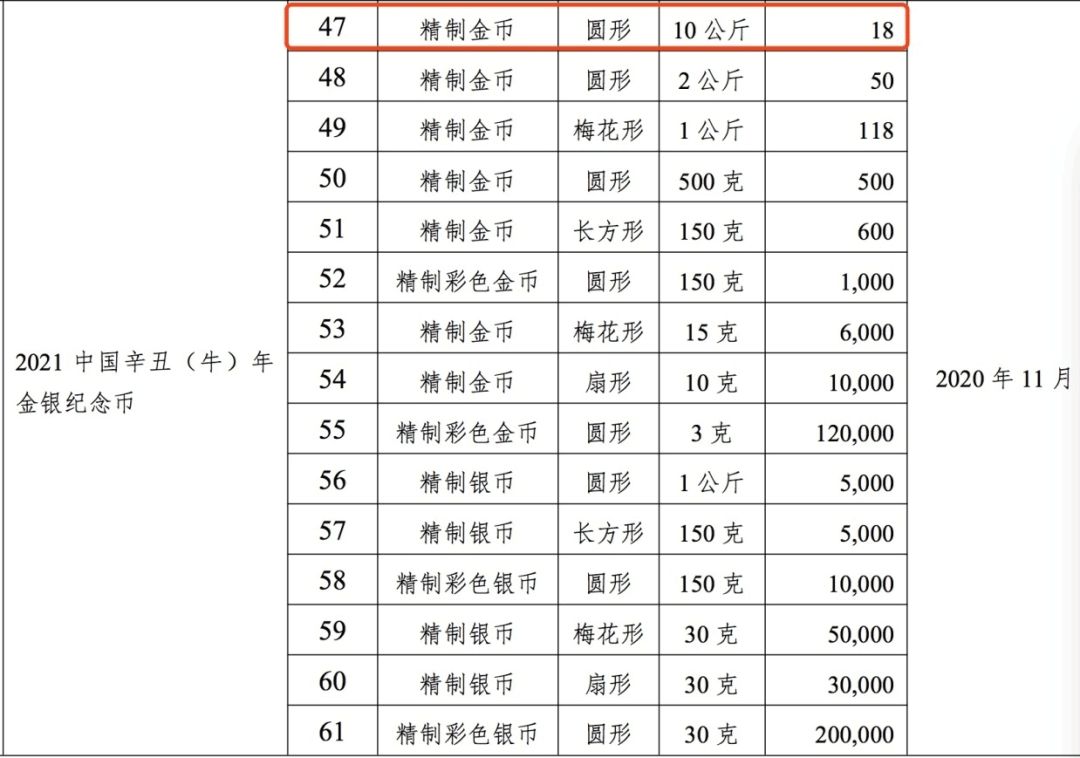 其中,辛丑(牛)年金银纪念币将发行10公斤金币。