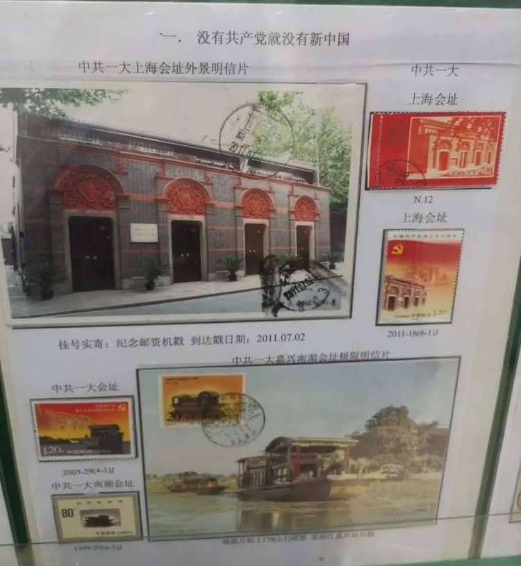 展览不仅展出了邮票,还包括极限明信片、实寄封、纪念封等,品类多样。比如这张中共一大嘉兴南湖会址极限明信片,其上方的邮票、明信片和邮戳上的图案高度一致,均表现的是嘉兴南湖红船。