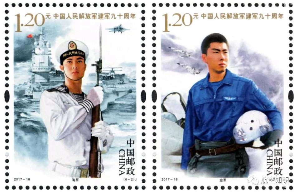 2017年8月1日,中国邮政发行《中国人民解放军建军九十周年》纪念邮票1套6枚,其中“海军”(左)邮票图案出现歼-15舰载机;“空军”(右)邮票图案出现歼-10战斗机。