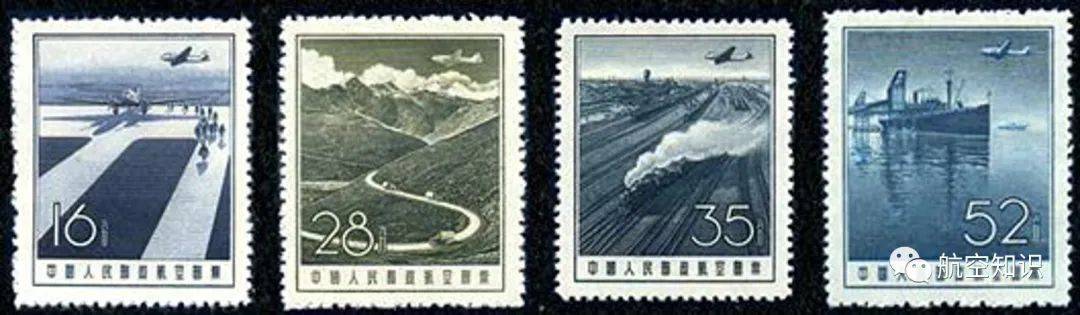 1957年9月20日,随着新中国交通运输事业的蓬勃发展,中国人民邮政发行了第二套航空邮票。图案从左到右,分别为“飞机场”、“公路汽车”、“火车货运中转站”、“轮船”。