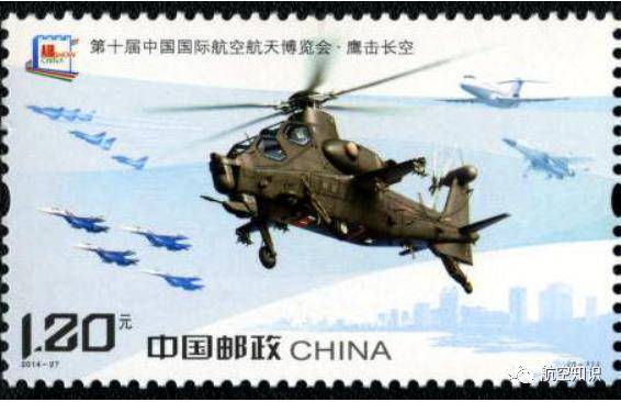 图案涵盖了中国的“武直-10”、“歼-10”、“歼-15”、“ARJ21-700”等先进机型,背景为航展举办地珠海的城市风光。