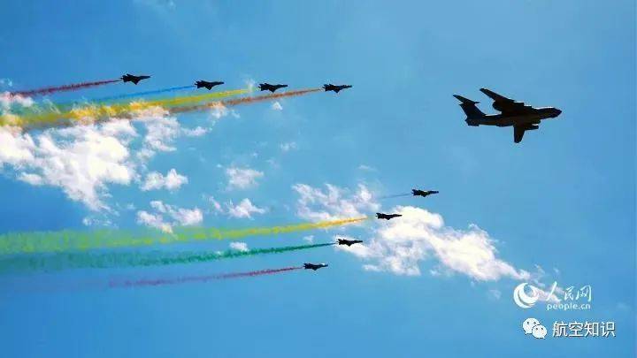 空军空警2000和空军“八一”表演队8架歼-7GB护卫机组成9机楔队通过上空。