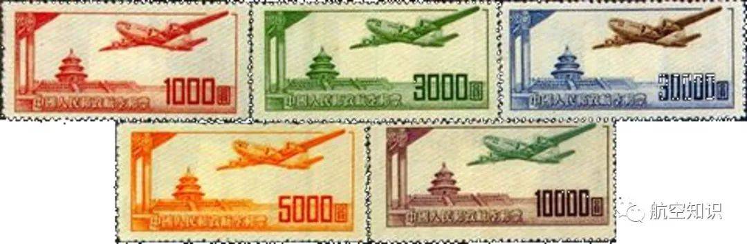 1951年5月1日,中国人民邮政发行了新中国成立后的第一套航空邮票,由于当时的中国还没有自己的飞机,因此图案为天坛和一架苏式“图-4”重型轰炸机。