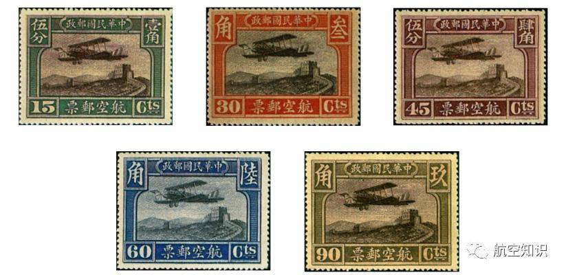 1921年7月1日,北洋中国航空署开办京沪航线,先开辟北京至济南段,航空邮务自此开始,中国第一套航空邮票也应运而生,共五枚,图案是老式的双翼飞机掠过长城,机尾绘五色旗徽。而后在1929年7年5日,北伐成功,全国统一,飞机尾部改用青天白日国徽。