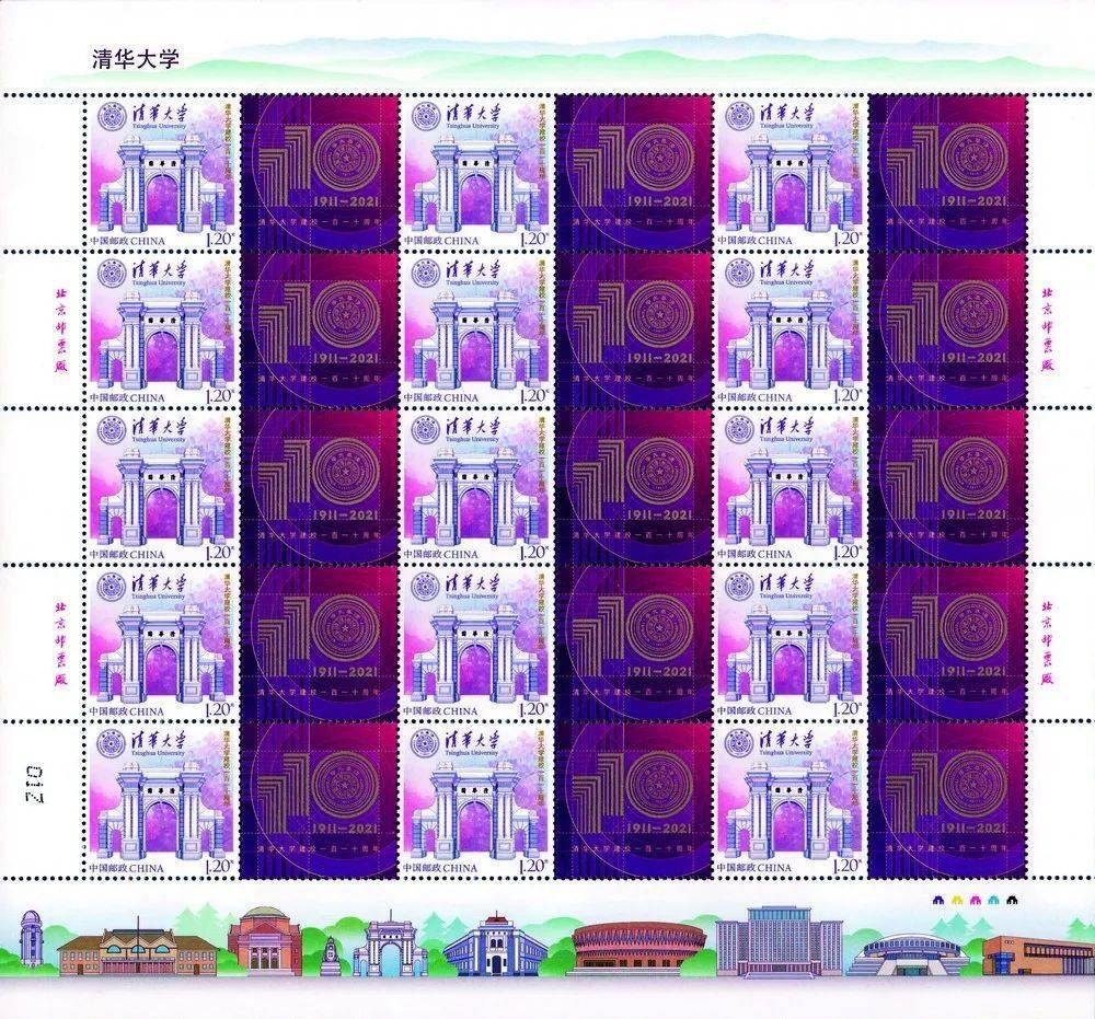 大版设计很精彩!!!在版式和其他个性化大版没有大的区别,但是增加了底纹,下方增加了清华大学的各大建筑。个性化大版首次采用胶雕套印,连版边的清华大学四个字都用了紫色的雕刻版线条,非常用心。