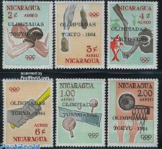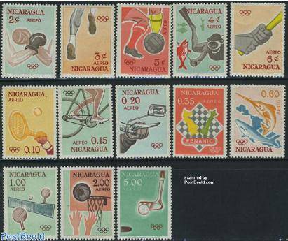 第一枚印有奥运会五环标志的乒乓球邮票也是尼加拉瓜发行的,该邮票是1963年12月12日发行的,票面右下角有五环标志,它是为1964年第18届奥运会发行的,全套13枚。到了第二年,尼加拉瓜邮政选了其中6枚,加盖了“1964东京奥运会”字样。