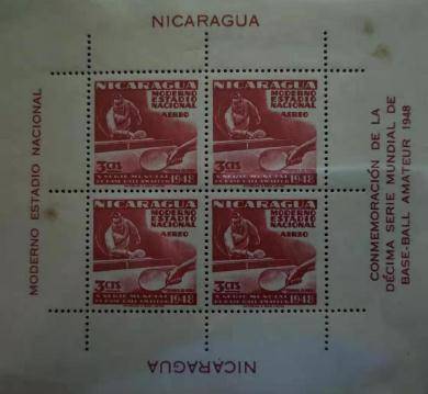 1949年7月15日,尼加拉瓜邮政发行了一套邮票,名字叫《纪念1948年第10届世界业余棒球锦标赛》,全套26枚,分平信邮票(平邮)和航空邮票(航邮)二种,邮商一般都分开销售。除了与主题相关的3枚棒球邮票之外,其余图案有足球、篮球、帆船、自行车等运动项目。