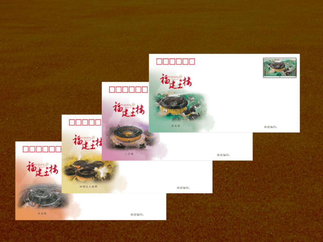 《福建土楼》特种邮票一套4枚,全套邮票面值为4。80元,邮票计划发行数量710万套,版式二计划发行数量95万版。该套邮票以土楼的四季为主题,表现了振成楼、二宜楼、田螺坑土楼群、承启楼,初溪土楼群和河坑土楼群作为版式一的过桥边饰。承启楼与二宜楼都被称为“土楼之王”,振成楼号称“土楼王子”,田螺坑土楼群被誉为“世界上独一无二的神话般的山区建筑模式”。四幅作品采用中国传统绘画工写结合的表现手法,色彩鲜明饱满,对土楼的文化内涵深入挖掘。在无限被重复的方形和圆形中,四季变化的微妙感受与天地参合的奥秘形象地表达出来,赋予土楼新的视角和色彩;光与影的变化使画面变得轻灵空旷;而高空俯视的视角则使构图体现出更富于扩张感的空间意识,演绎出与众不同的土楼造型与人文气息,突显土楼这种建筑形式承载的向心、团结的情感内蕴,同时版式一、二均饰以精美的绘画,土楼的主题跃然纸上。
