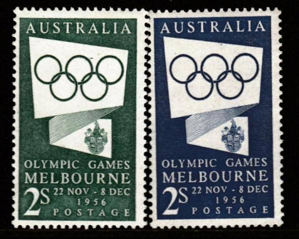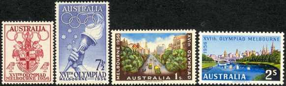 另外4枚邮票于1956年10月31日发行,图案分别为奥运五环及墨尔本市徽、奥运五环及火炬、墨尔本柯林斯大街和墨尔本及雅拉河。