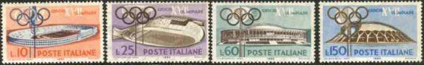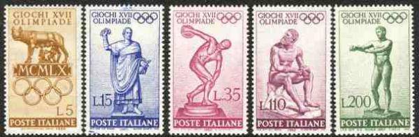 1960年6月25日,意大利邮政部门又发行了一套邮票,5枚竖图、4枚横图,其中5里拉面值邮票图案是罗马奥运会会徽;10里拉面值邮票图案是罗马奥运会体育场;15里拉面值邮票图案是发令员;25里拉面值邮票图案为自行车赛场;35里拉面值邮票图案为“掷铁饼者”雕塑;60里拉面值邮票图案为体育宫;110里拉面值邮票图案为“休息中的角斗士”;150里拉面值邮票图案为小体育宫;200里拉面值邮票图案为《刮汗污者》。