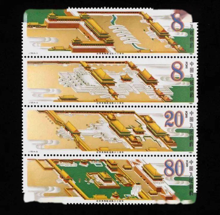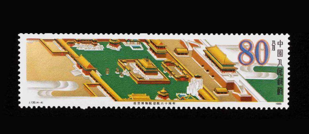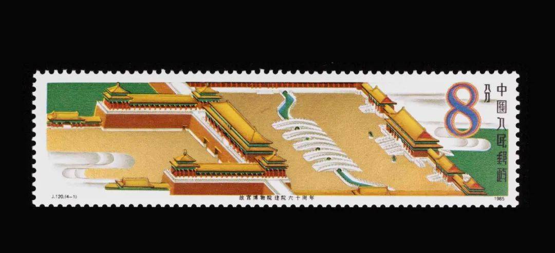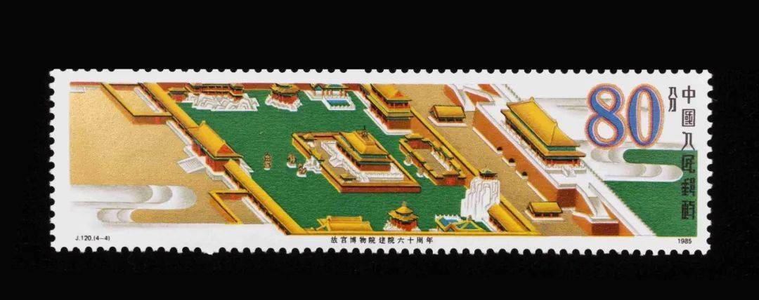 在这枚小型张上,我们可以充分感受故宫不仅规模宏大,而且具有一种对称美。午门—前三殿—后三宫—神武门不仅构成了故宫的中心线,也定义了首都北京的中轴线年发行的《故宫博物院建院六十周年》邮票上,设计家邵柏林先生就选取了故宫中轴线为主要表现对象。
