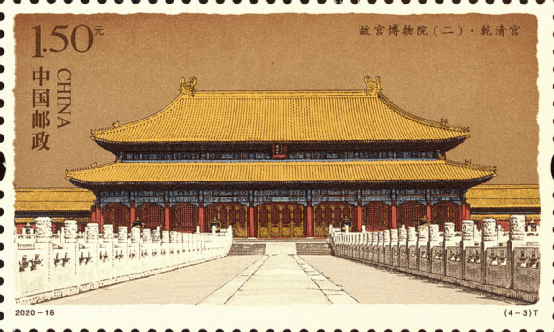 乾清门。乾清门为内廷的正宫门,是连接内廷与外朝往来的重要通道,在清代又兼为处理政务的场所。邮票中的乾清门在阳光的照射下流光溢彩,明黄色的背景更将其映衬得华贵富丽。