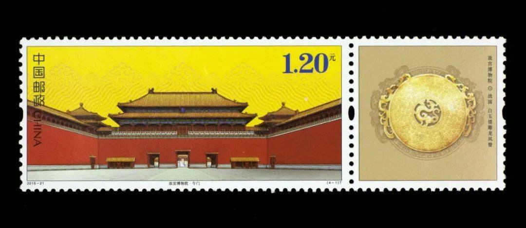 故宫建筑群规模宏大壮丽、建筑精美、布局统一,集中体现了我国古代建筑艺术的独特风格,因此颇受邮票设计师的青睐,曾多次登上邮票。2015年故宫博物院建院90年,2020年紫禁城600年,中国邮政先后发行了《故宫博物院》第一、二组邮票,以国家名片铭记故宫的重要纪念性时点。特别是《故宫博物院(二)》小型张首次将故宫全部建筑平面图完整呈现于邮票上,以方寸之地承载故宫72万平方米的宏伟建筑群,集中体现了故宫建筑的整体恢弘之美。