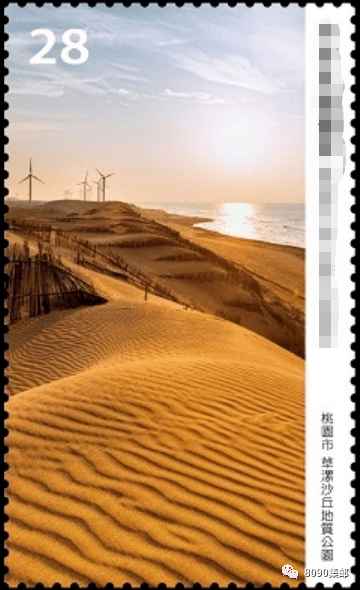 面值28元新台币的是“草漯沙丘地质公园”,其位于桃园市大园区老街溪出海口至观音区大堀溪出海口间之沿海地帯,成形于强劲的东北季风、南风吹至陆地的漂沙堆积。