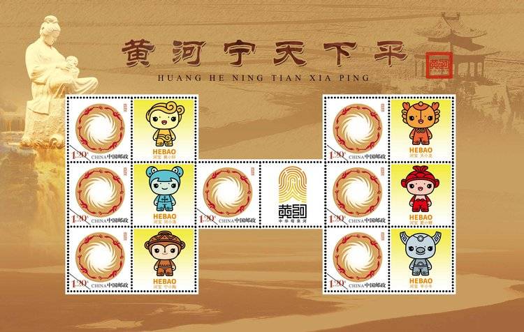 而6枚首日封,分别以6个河宝形象为主要表现元素,辅以相关背景元素,并加盖了当天启用的6枚彩色邮资机戳,使黄河标志和吉祥物形象更加生动丰富。