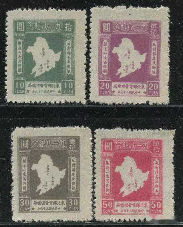 该套邮票一套4枚,图案相同,就是刷色和面值各异。邮票的图案主体为中国东北三省地图,图中明确标明三省省会的位置和各省名称。图案上方印刷邮票主题—“九一八纪念”,下方印刷“东北邮电管理总局★中华民国三十六年★”发行单位和发行时间,左右两侧印刷当时的口号“反对蒋美反动派,制造二次满洲国”。
