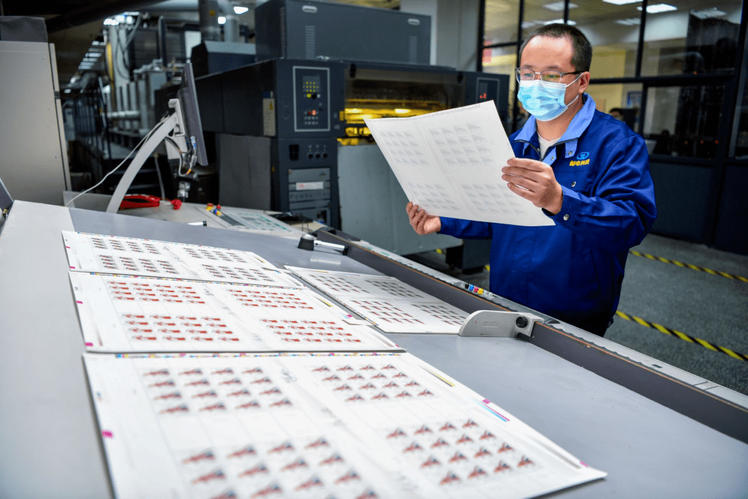 9月29日,这套邮票也正式开机印刷,在该套邮票印制环节中采用了UV冷烫、珠光油墨、特殊油墨等多种印制工艺,在我国已经发行的戏剧类邮票中开创了三个“首次”。