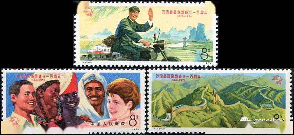 中国在1914年就加入了万国邮政联盟,但是因为历史问题,新中国于1972年4月13日才正式恢复在万国邮政联盟的合法地位。所以在1974年5月15日发行了纪念《万国邮政联盟成立一百周年》的纪念邮票,一套三枚。