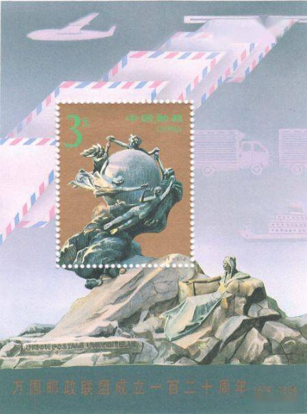 新中国第二次发行万国邮联的邮票是在1994年,万国邮联成立120周年的时候。这次邮政以发行小型张的规格进行纪念,可见邮政当时的重视度,这次邮政选择的是万国邮政门口的雕塑为设计元素,更是邀请吴建坤老师为其保驾护航,只不过这个设计啊,各位小伙伴自己看吧。。。 。。。
