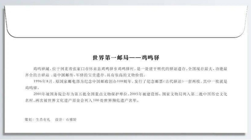 (自主开发的鸡鸣驿特色纪念封,由国家邮政集团公司邮票印制局印刷,并加盖纪念戳及1995年8月发行的《古代驿站·鸡鸣山驿》纪念邮票一枚,可以邮寄远方亲人好友,传达问候,也可收藏)
