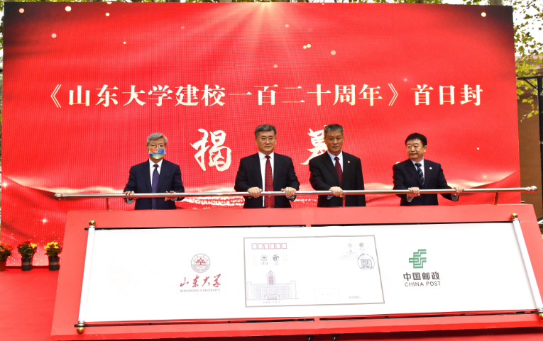 山东大学党委书记郭新立,山东大学校长樊丽明,中国邮政集团有限公司党组书记、董事长刘爱力,中国邮政集团有限公司山东省分公司党委书记、总经理韩广岳,共同为《山东大学建校120周年》纪念邮票揭幕;山东大学常务副校长王琪珑,山东大学党委常委、宣传部长桑晓旻,中国邮政储蓄银行股份有限公司高级资深经理、山东省分行党委书记、行长焦玉泉,中国邮政集团有限公司山东省分公司副总经理林令才,共同为《山东大学建校120周年》首日封揭幕。