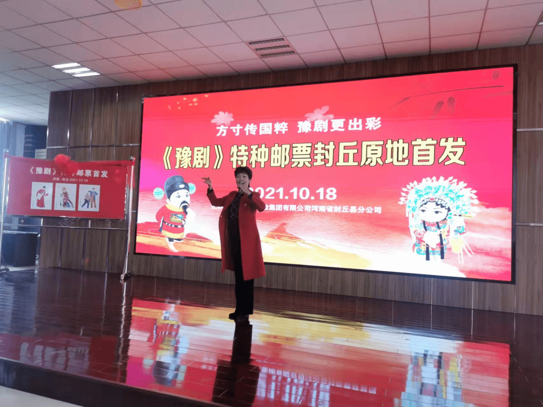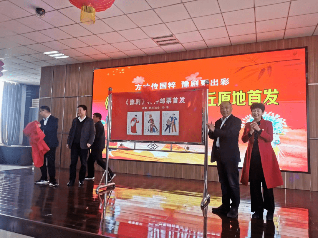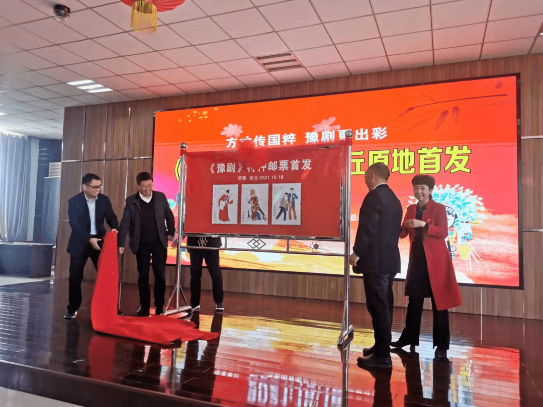 邮票发行仪式在县邮政局五楼会议室举行,县委宣传部副部长张志超、县文联主席衡德强、豫剧祥符调封丘传承人关小凤、中国邮政集团有限公司封丘县分公司总经理杨建峰共同为《豫剧》特种邮票发行揭幕。