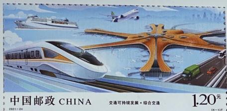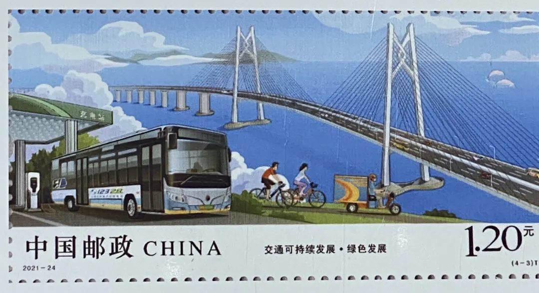 第三枚绿色发展,通过电动公交车和充电站、共享单车、快递车辆、港珠澳大桥、中华白海豚等元素,体现了资源集约利用、绿色发展、绿色出行的概念。