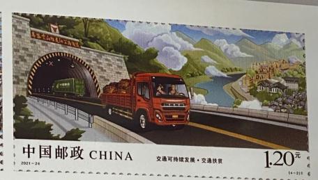 第二枚交通扶贫,通过高黎贡山独龙江公路隧道、独龙江乡以及往来运输的车辆等,体现了通过交通建设帮助贫困地区脱贫,促进经济发展的概念。