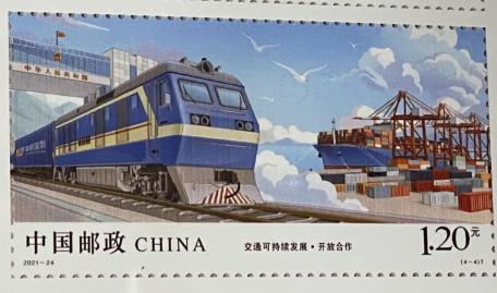 第四枚开放合作,通过中欧班列穿越国门场景、货运港等元素,体现了交通开放合作,促进发展的精神。