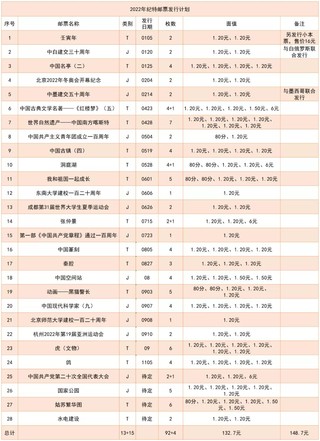 人民网北京10月26日电 (记者杨虞波罗)记者从国家邮政局获悉,2022年纪特邮票计划发行28套,其中纪念邮票13套,特种邮票15套。