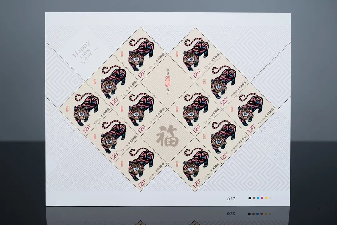 该套邮票由北京邮票厂有限公司采用影写工艺印制。《壬寅大吉》邮票“虎”面部图案采用专金印刷提升质感,虎身条纹色彩饱和、层次丰富。《五福临门》邮票使用专金油墨对“福”字、“五蝠”图案进行边缘描绘,突出设计主旨;同时采用无色红荧光油墨工艺使邮票图案在紫光灯下呈现亮丽红色,烘托出浓郁的喜庆气氛。